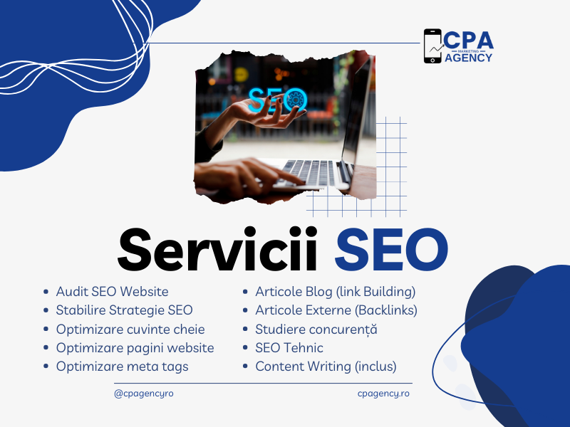 CPA Agency este o Agentie de Marketing din Cluj specializata in Servicii SEO, Google Ads, Facebook Ads si Social Media. Ne concentram pe rezultate tangibile si ajutam afacerile sa creasca prin strategii personalizate si campanii eficiente. Hai sa ducem impreuna prezenta online a afacerii tale la urmatorul nivel.
